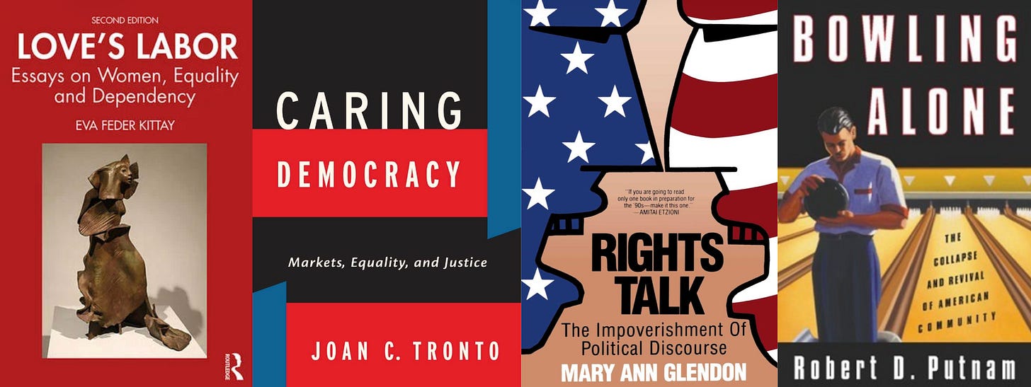 This is a really helpful breakdown of all the different perspectives on this topic, Martin. (And thank you for including my article!) I especially like Maurice Hamington's idea that we can "push care at all levels, in all directions". Different levels of action don't have to be incompatible! And different actors can have both overlapping roles and their unique contributions: a state won't ever be able to love someone the way a family can, but there are some basic services that could never be properly provided to everyone by another institution than the state.